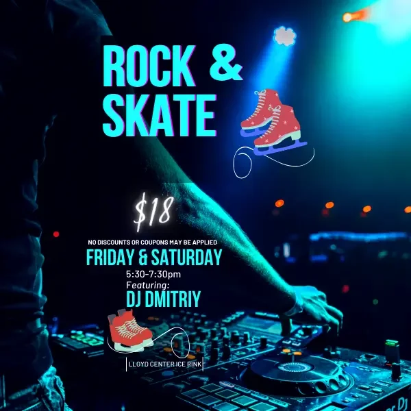 Come to the Lloyd Center Ice Rink Friday, September 26 and Saturday, September 27 from 5:30-7:30 for Rock & Skate featuring DJ DMITRIY.
